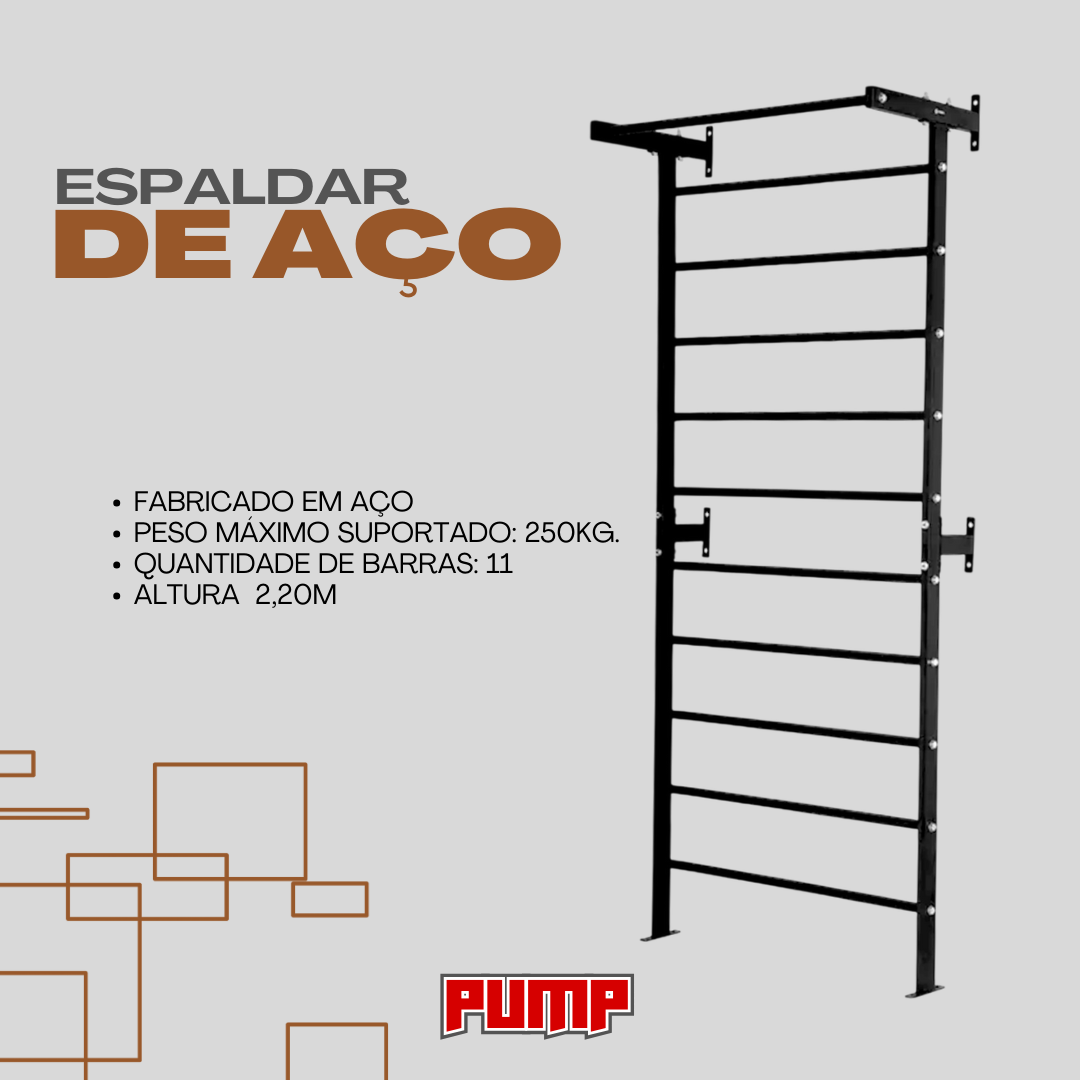 O espaldar conta com um design fixo que oferece segurança durante o uso, ideal para profissionais de educação física e entusiastas do esporte.
